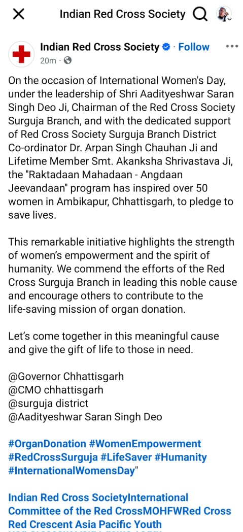 अंबिकापुर. रेडक्रॉस सोसायटी ऑफ इंडिया ने एक्स पर ट्विट कर रेडक्रॉंस सोसायटी सरगुजा के चेयरमैन आदित्येश्वर शरण सिंहदेव एवं उनकी टीम को महिला दिवस पर