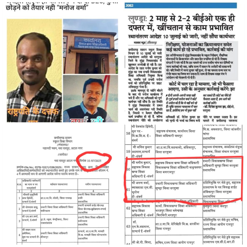 इस पूरे प्रकरण का केंद्र बिंदु सरगुजा जिले के लुंड्रा विकासखंड के खंड शिक्षा अधिकारी (BEO) पद पर है। जुलाई के आदेशों के तहत व्याख्याता (एल.वी. भूगोल, टी-सेवर्ग) मनोज वर्मा को प्रतिनियुक्ति पर लेते हुए सहायक प्राध्यापक के पद पर डाइट (जिला शिक्षा एवं प्रशिक्षण संस्थान) अंबिकापुर, सरगुजा भेजा गया था। लेकिन राजनीतिक संरक्षण के दबाव में उन्हें तुरंत ही BEO लुंड्रा की जिम्मेदारी वापस सौंप दी गई। सूत्र बताते हैं कि मनोज वर्मा को विधायकों के चहेते के रूप में देखा जा रहा है, जिन्होंने विकासखंड स्तर पर अपना ‘डेरा’ जमाने के लिए दबाव बनाया।