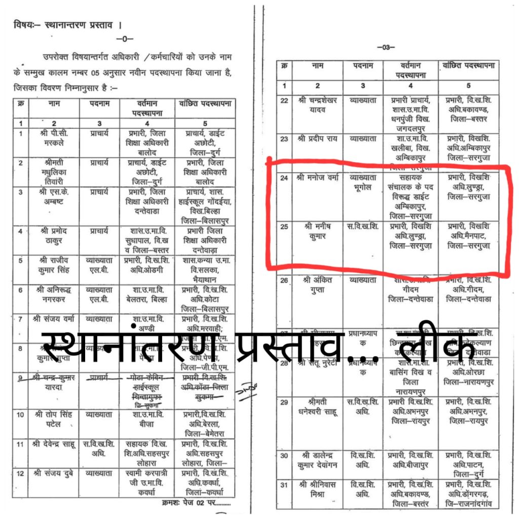 10 जुलाई 2025 को छत्तीसगढ़ शासन के स्कूल शिक्षा विभाग, मंत्रालय द्वारा जारी आदेश के तहत पूरे राज्य में 183 अधिकारियों और कर्मचारियों का बड़े पैमाने पर स्थानांतरण किया गया था। इस सूची में जिला शिक्षा अधिकारी (DEO), खंड शिक्षा अधिकारी (BEO) और अन्य पदाधिकारियों के नाम शामिल थे, जिन्हें विभिन्न जिलों में नई जिम्मेदारियां सौंपी गईं। उद्देश्य बताया गया था शैक्षणिक कार्यों में दक्षता, पारदर्शिता और बेहतर प्रबंधन सुनिश्चित करना। लेकिन ये फेरबदल अभी ठंडे भी नहीं पड़े थे कि सितंबर 2025 के अंत में नई तबादला सूची जारी हो गई, जिसमें 130 से अधिक प्राचार्यों और शिक्षकों के स्थानांतरण के साथ-साथ कुछ BEO पदों पर भी बदलाव किया गया।