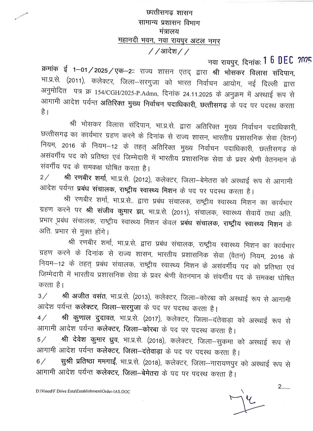 अम्बिकापुर ब्रेकिंग सरगुजा कलेक्टर भोसकर विलास संदीपन का हुआ स्थानांतरण, सामान्य प्रशासन विभाग के आदेश से बड़ा फेरबदल, भोसकर विलास संदीपन अब अतिरिक्त मुख्य निर्वाचन