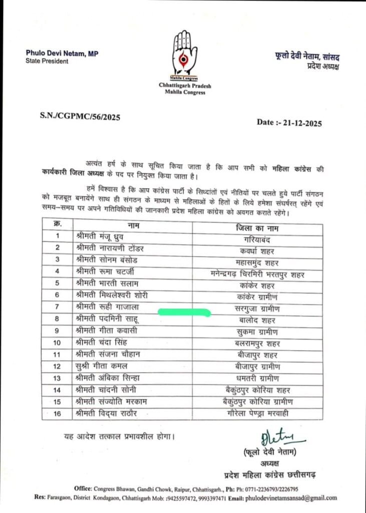 अंबिकापुर. छत्तीसगढ़ प्रदेश महिला कांग्रेस ने सरगुजा जिले में संगठन को और अधिक सशक्त करने की दिशा में बड़ा कदम उठाया है। प्रदेश महिला कांग्रेस अध्यक्ष एवं सांसद फूलो देवी नेताम ने सरगुजा ग्रामीण के लिए रूही गजाला को कार्यकारी जिला महिला कांग्रेस अध्यक्ष नियुक्त किया है।