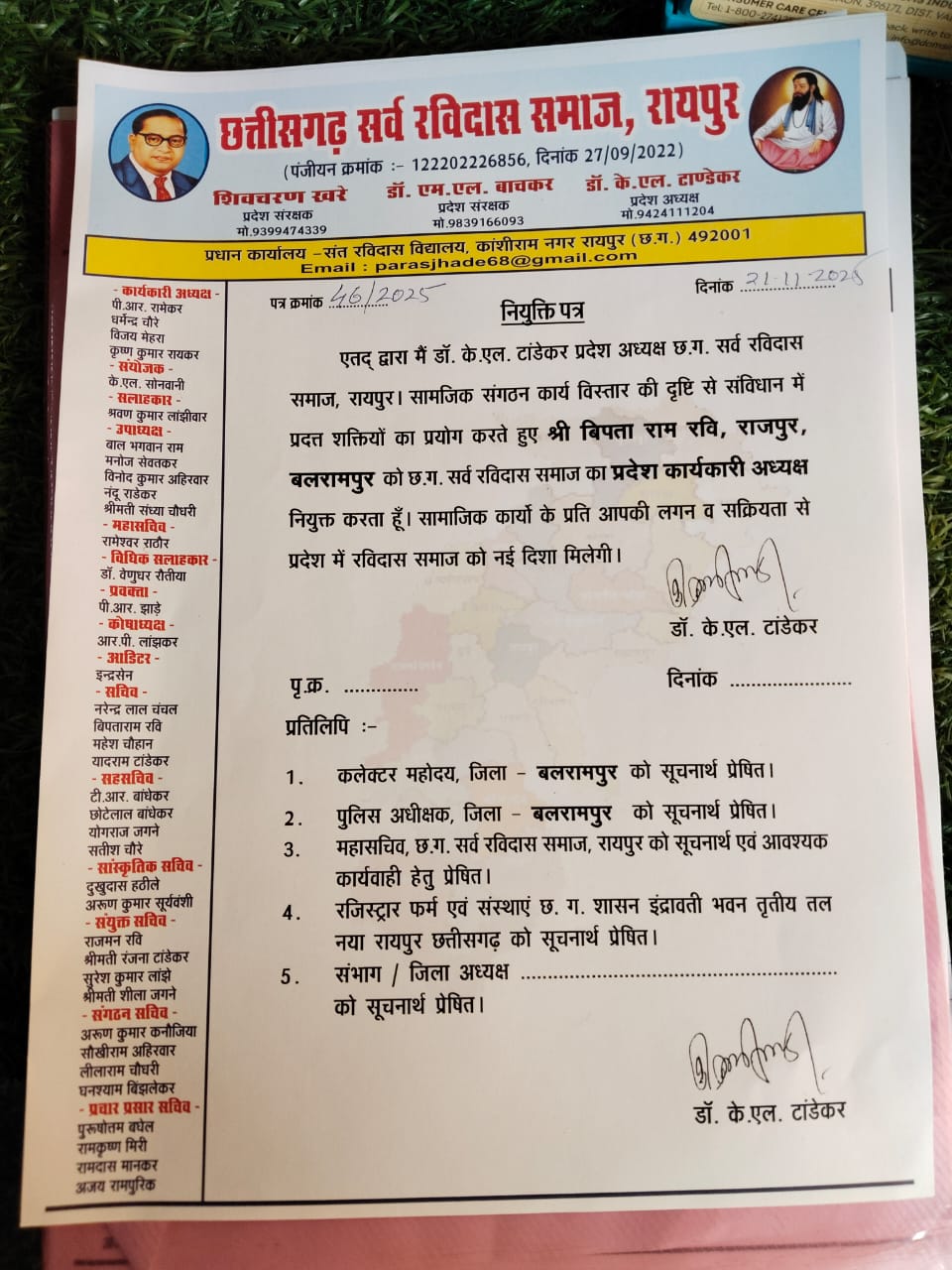 रिपोर्टर,,,, कृष्ण नाथ टोप्पो,,,, बलरामपुर राजपुर। छत्तीसगढ़ सर्व रविदास समाज के प्रदेश अध्यक्ष डॉ. के.एल. टांडेकर ने समाज संगठन के विस्तार और सशक्तिकरण की दिशा