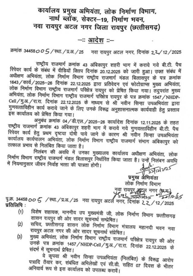 रायपुर. लोक निर्माण विभाग ने गुणवत्ताहीन कार्य पर त्वरित कार्रवाई करते हुए उप अभियंता को तत्काल प्रभाव से निलंबित कर दिया है। राष्ट्रीय राजमार्ग क्रमांक-43